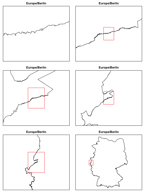 Simplified datasets are important because the dramatically speed up both spatial searches and creation of plots when fast is more important than hyper-accurate. The conversion of the WorldTimezone dataset used above generates a .rda file at full resolution as well as additional versions with 5%, 2% and 1% as many vertices. In the plot above, the 5% version was used to create the the last three plots where high resolution squiggles would never be seen. File sizes for the WorldTimezone .rda files are 67 M, 3.4 M, 1.4 M and 717 K respectively.